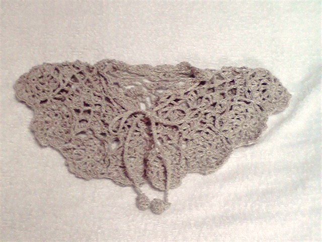 あまった糸使ったから、見本とは糸が違うし、さらに針の号数の選択間違えて、モチーフが小さくなってしまったんで、3つほど増やしてなんとかやりくりしようと思ったけど、首元まで編み進むうちにどんどん小さくなって首にしっかり巻きつくサイズになってしまいそうだったので、適当にやめて適当に仕上げた。