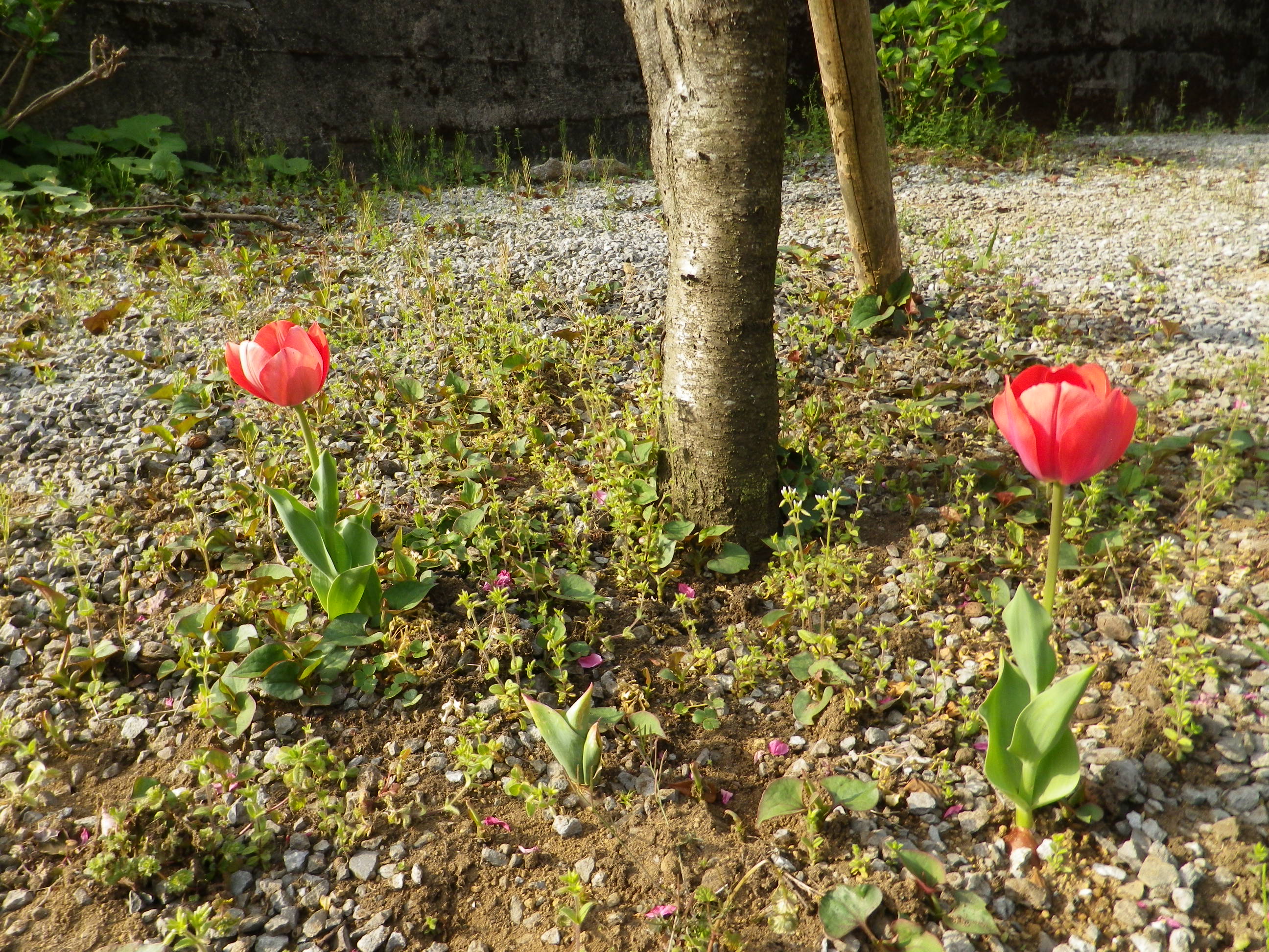 郵便局チューリップが2つ咲いた。