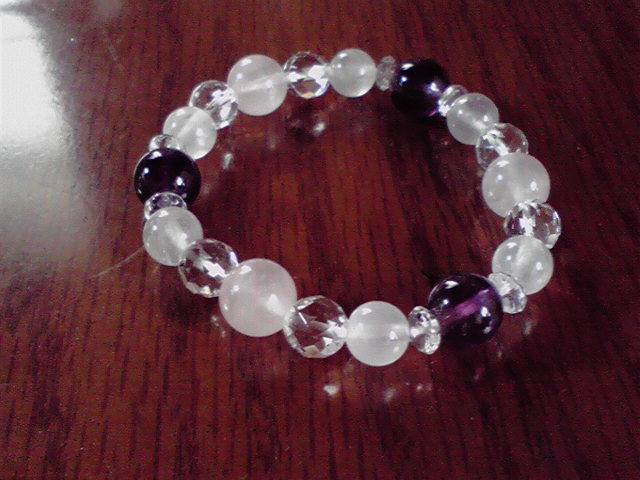 ここのアメジストは高いらしく、全部アメジストだと予算をはるかに超えるようなので、お安いローズクォーツを混ぜてあとは水晶でつないでもらった。