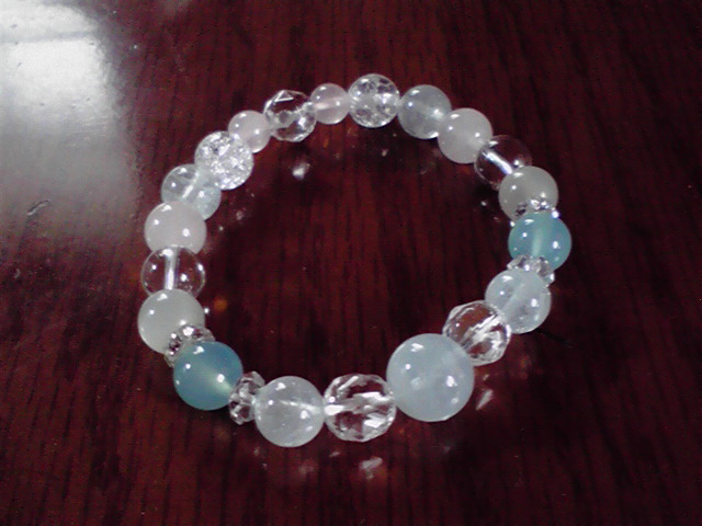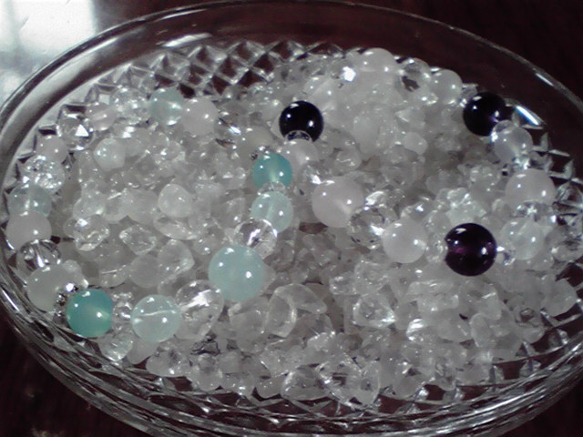 アクアマリンの店は、ブレスはゴムを使ってつないでいるから、塩はゴムが固くなると言って、水晶のじゃりじゃりしたやつに乗せておけばいいと言われたので、じゃりじゃりを一袋買った。