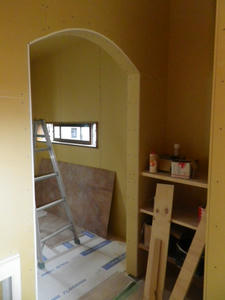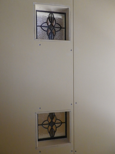 気まぐれというか気休めというかとりあえずというかステンドグラス2枚。この後棟梁から、上と下の色が違う表裏があるかもしれないという話が合って、表から見たり裏に回ったりと二人で行ったり来たりして、結局裏表ひっくり返えした。