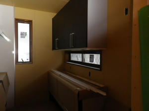 最初にできてきたプランは、冷蔵庫がキッチンからはみ出ていて、これはなんだか嫌だったので、何とかして欲しいと願い出た。その結果キッチンの中に冷蔵庫は収まった。そしてその冷蔵庫は、常識的な位置として、一番奥に置かれ、その横は収納ということになる。