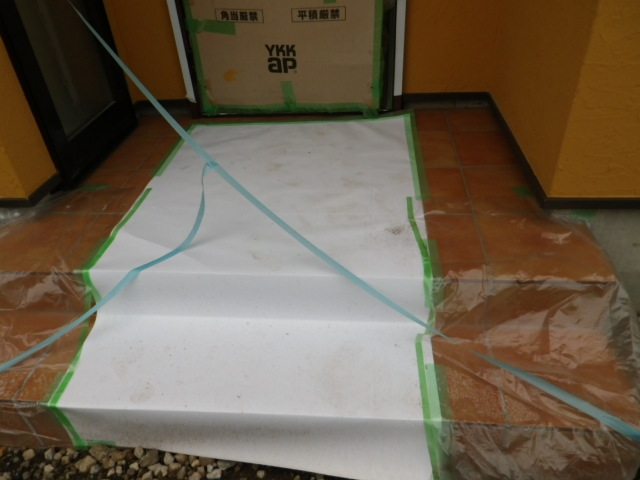 今日は、仕事を終えて見に行ったら、もう職人さんは帰っていて、玄関タイルは貼り終えていたけど、ビニールがかぶせてあってさらにその上にシートが乗っていた。入っちゃだめよのためなのかどうなのか微妙なビニールテープが張られていた。勝手口のカギは持っていないので、今日のところはここまでにした。