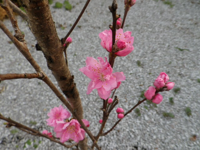 昨日までつぼみだった桃の花がぽつぽつ咲き始めた。