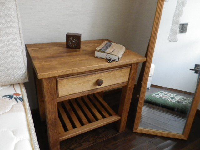 古い家から持ってきた籐家具をサイドテーブル代わりにしてたけど、これもどうせならってことで、ネットであちこち物色して、「色の変更」のみお願いしたセミオーダーのサイドテーブル。
