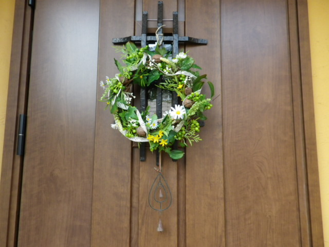 昨日、アレンジメントの稽古で作ってきたリースを玄関に飾った。