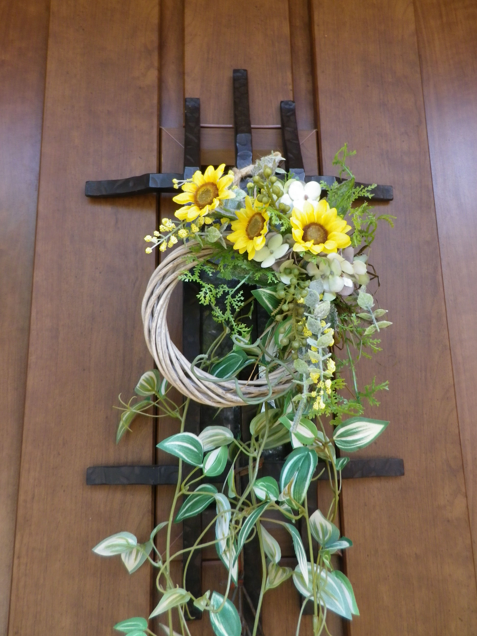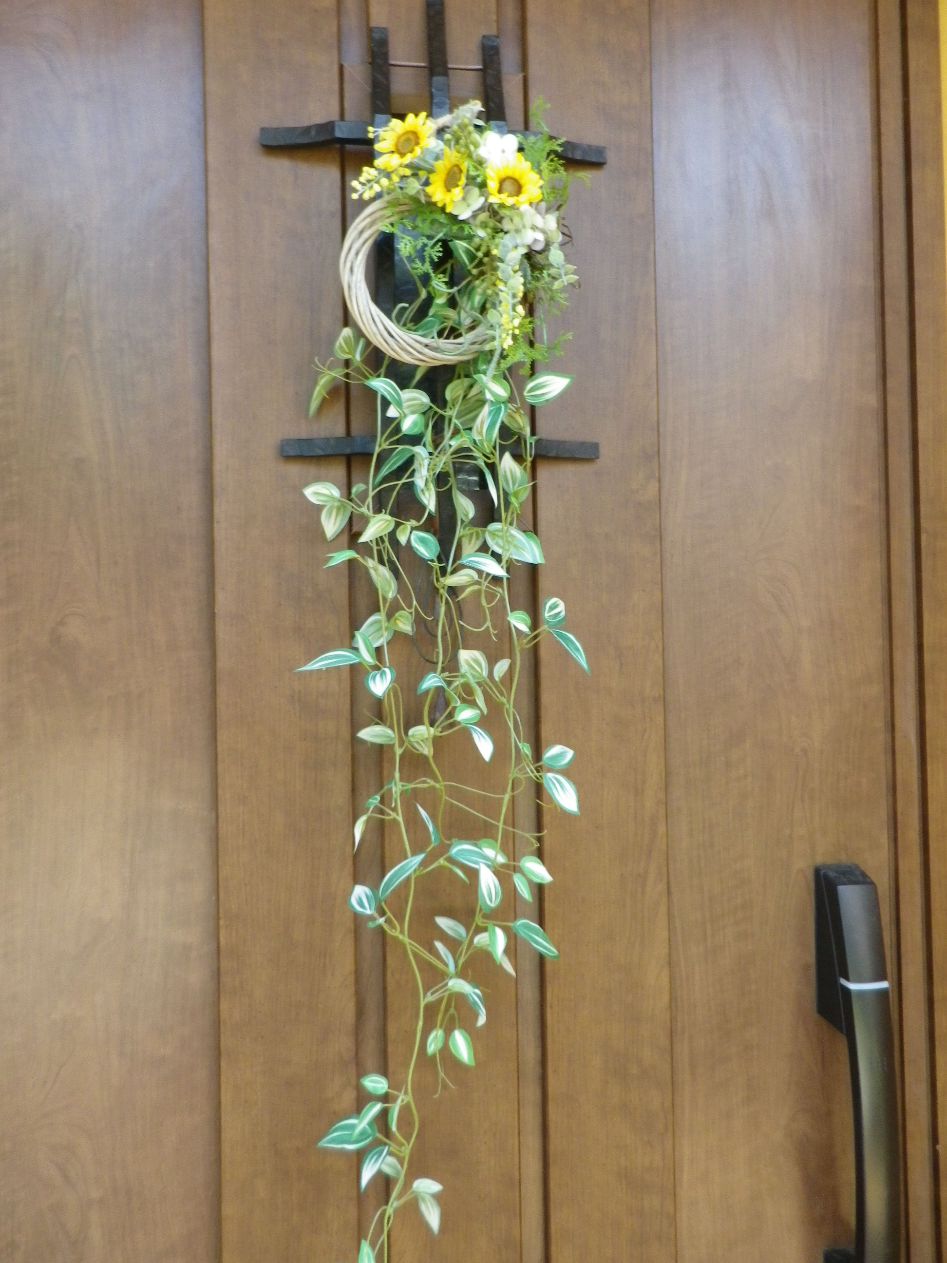 安さにつられてネットでミニひまわりのリースを買ったけど ちょっと小さかったので、単独で使おうと思っていた葉っぱをさげてみた。